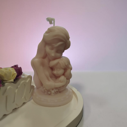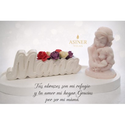 Incluye una elegante base decorativa elaborada en resina ecológica, acompañada de la palabra “Mamá” y un delicado arreglo floral que aporta un toque romántico y natural. A su lado, una encantadora vela con forma de madre e hija, símbolo del vínculo más puro y especial.